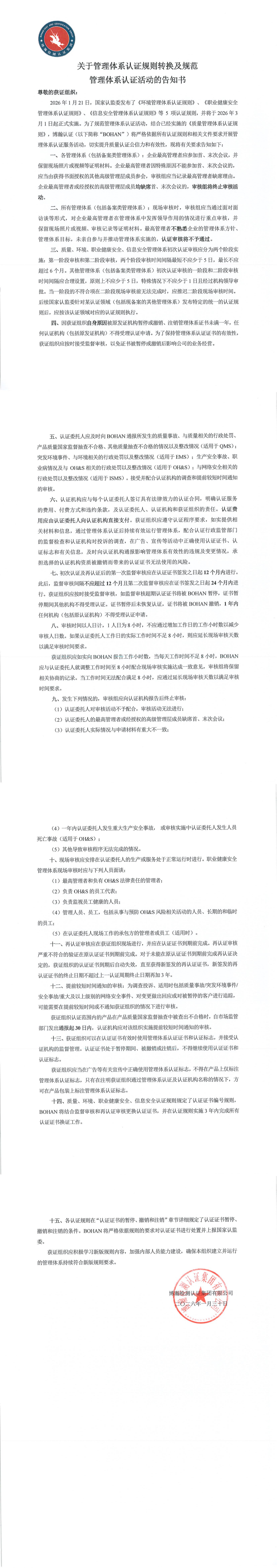 关于管理体系认证规则转换及规范管理体系认证活动的告知书